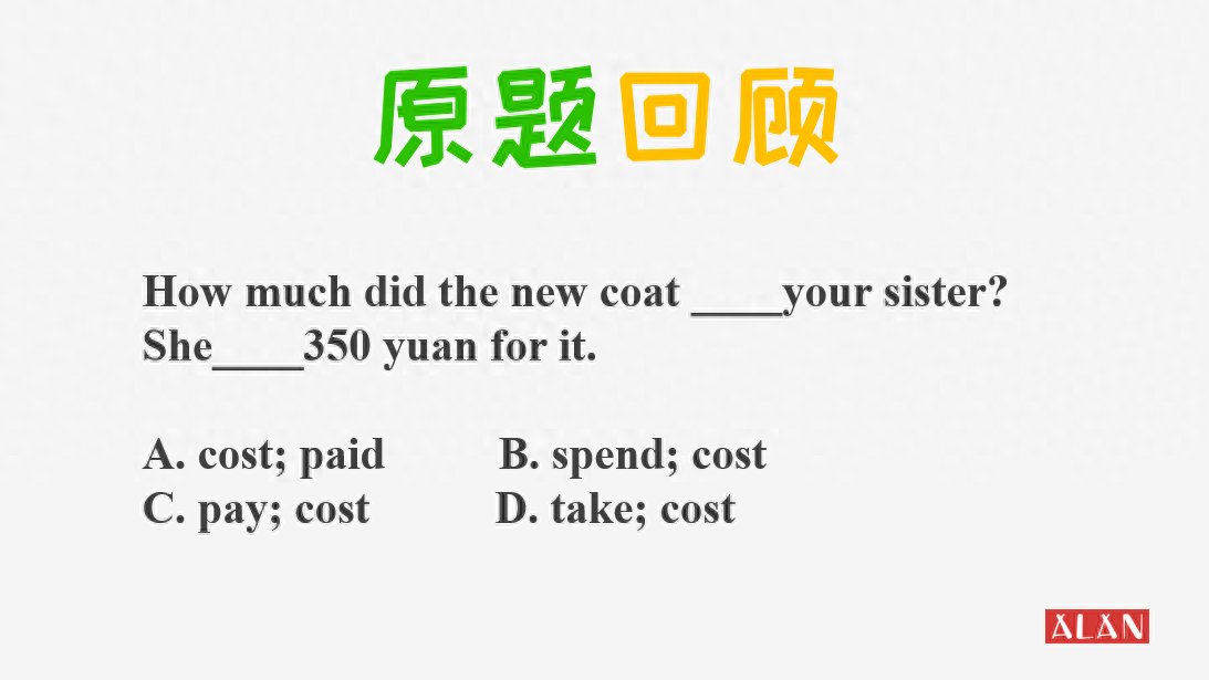 今天的这道题目,不知道大家会做么?你们都选了哪个选项?这道题的迷惑性可不小,我们看到题目中问:“这件新的外套花了你姐姐多少钱”?回答说:“她花了350元。”我们需要填上表示花费的词。