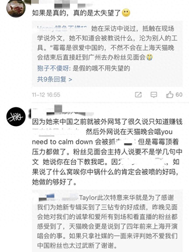 除此之外,粉丝还表示此次霉霉来华活动其实是顶住了很大的压力,但是她还是在坚持在双十一晚会上唱了“you need to calm down”。粉丝说这次霉霉来华活动其实是展现出了中国的友好与自由,外网粉丝都在称赞这次的舞台。