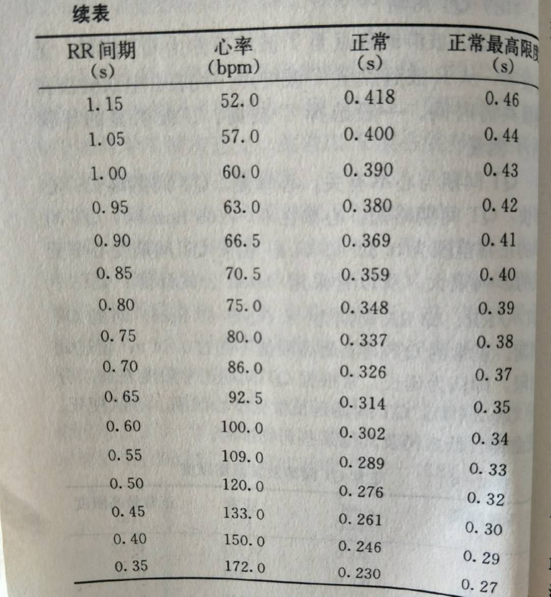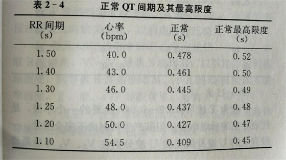 QT间期与心率有关,心率慢。QT间期略长,心率快,QT间期略短,心率在60-100bpm时,QT间期的正常范围为0.32-0.44s。由于QT间期受心率变化的影响很大,所以常采用Bazett公式计算:QTc=QT/RR(根号下)。即RR间期为1s(心率60bpm)时的QT间期。正常的QT间期最高限制不超过0.44s,超过此时限及认为延长。常根据QT间期的正常时限度表加以分析,QT间期延长。常见于心肌病、心肌梗死、低血钾、低血钙及其他某些药物影响。