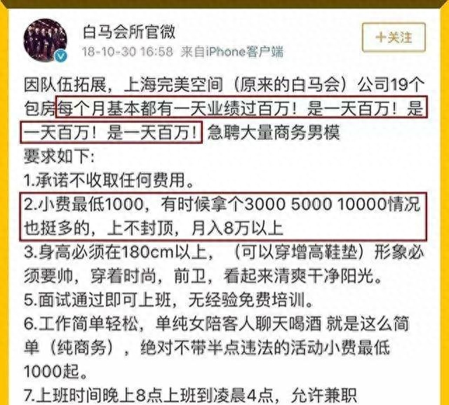早年间它的官微曾发过一条招牌广告,因队伍扩大,急招大量商务男模,要求身高以上必须要帅,会穿衣,打扮时尚,前卫。而工作内容则是陪女客人喝酒,纯商务活动,不带半点违法内容,小费最低1000起。