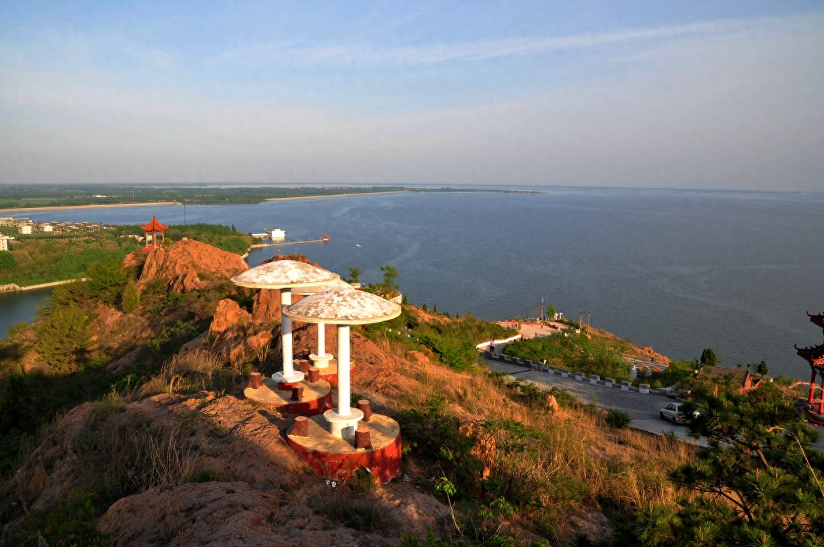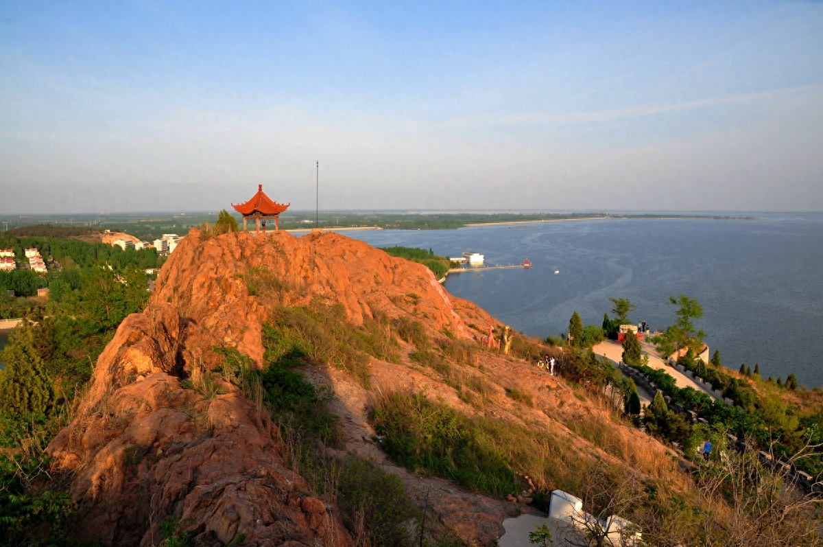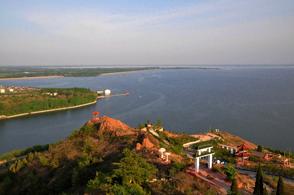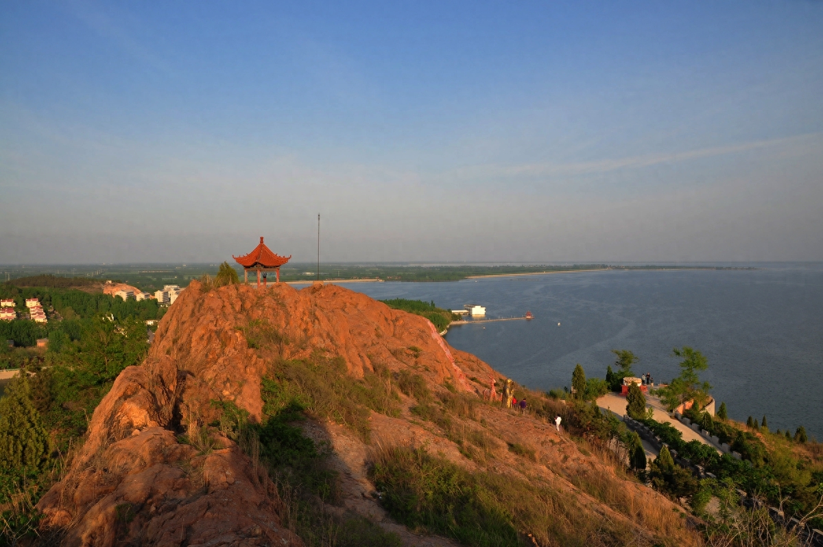 峡山水库因泄洪闸西侧的峡山而得名。峡山当地人也叫它“斜山”,峡山因北坡陡峭嶙峋,南坡峡谷中嵌,故称峡山。峡山早年山上有空军的雷达站,早已撤编。当地的村民在山上建了供奉玉皇大帝的道教庙宇,伯温祠等香火很旺。我的老家在峡山水库北的胶济铁路旁边,尽管经常回老家但不经常爬峡山。我的老家在峡山水库北15华里的胶济铁路车站旁,也时常回老家,但不经常爬峡山。今年的5月2日下午爬了一趟峡山。5月2日天气很给力,蓝天白云。等到山顶鸟瞰峡山水库,烟波浩渺,波光粼粼。