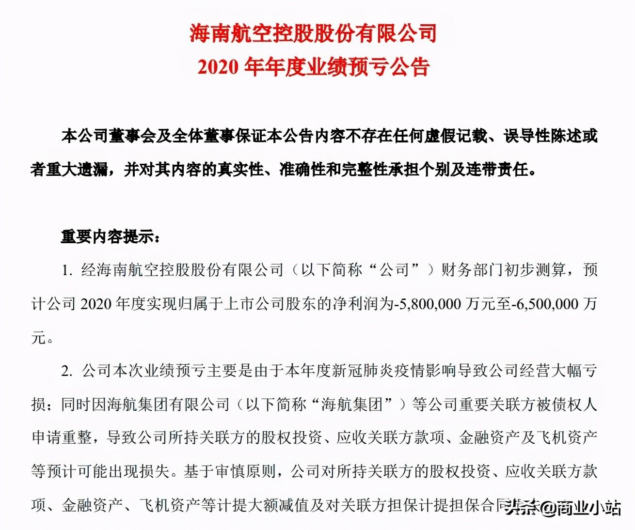 海航控股近日公告,预计2020年度亏损580亿至650亿。