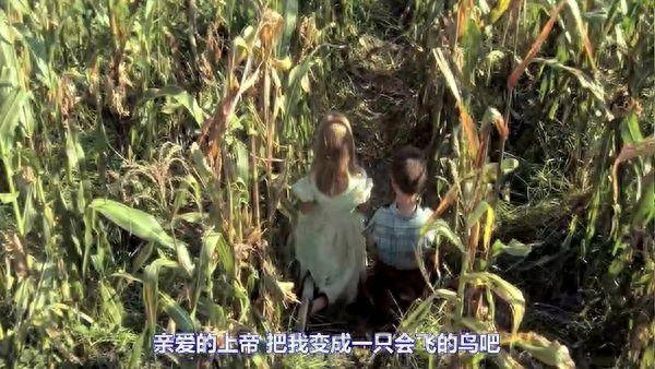 第二处是阿甘和珍妮在玉米地的情节。小时候的阿甘去找珍妮玩,珍妮拉着阿甘跑进玉米地虔诚许愿,希望自己可以变成一只鸟,飞离这个令她倍感创伤的地方。此时的珍妮穿着撕破的衣服,身上还有血迹。