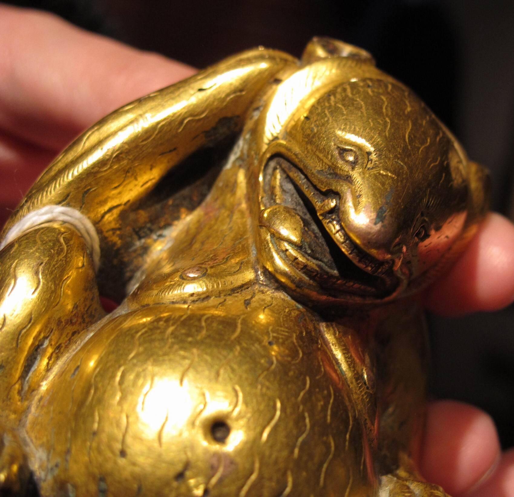 熊的艺术形象在中国最早应见于商代,而安思远案头的这件铜鎏金熊则是西汉之物,工艺精细,品相不错,其最特别之处或许在于大肚翩翩,憨态可掬的形象(亮点是居然吐着小舌头,hoho)。我们几年前去采访安思远的时候,这件金熊就放置于安思远先生的案头,他一边访谈一边抚摸着金熊,可见是他的一件“朝夕相对”之物。此类席镇在以往的市场上往往并没有特别高的成交记录,而这只安思远先生市场把玩的“玩具熊”估价20-30万美元,已经并不算便宜,但是大象告诉大家的事实是,这件“一号拍品”已经有人看到了100万美元!如果真是如此,这将绝对是该类藏品的成交世界纪录。