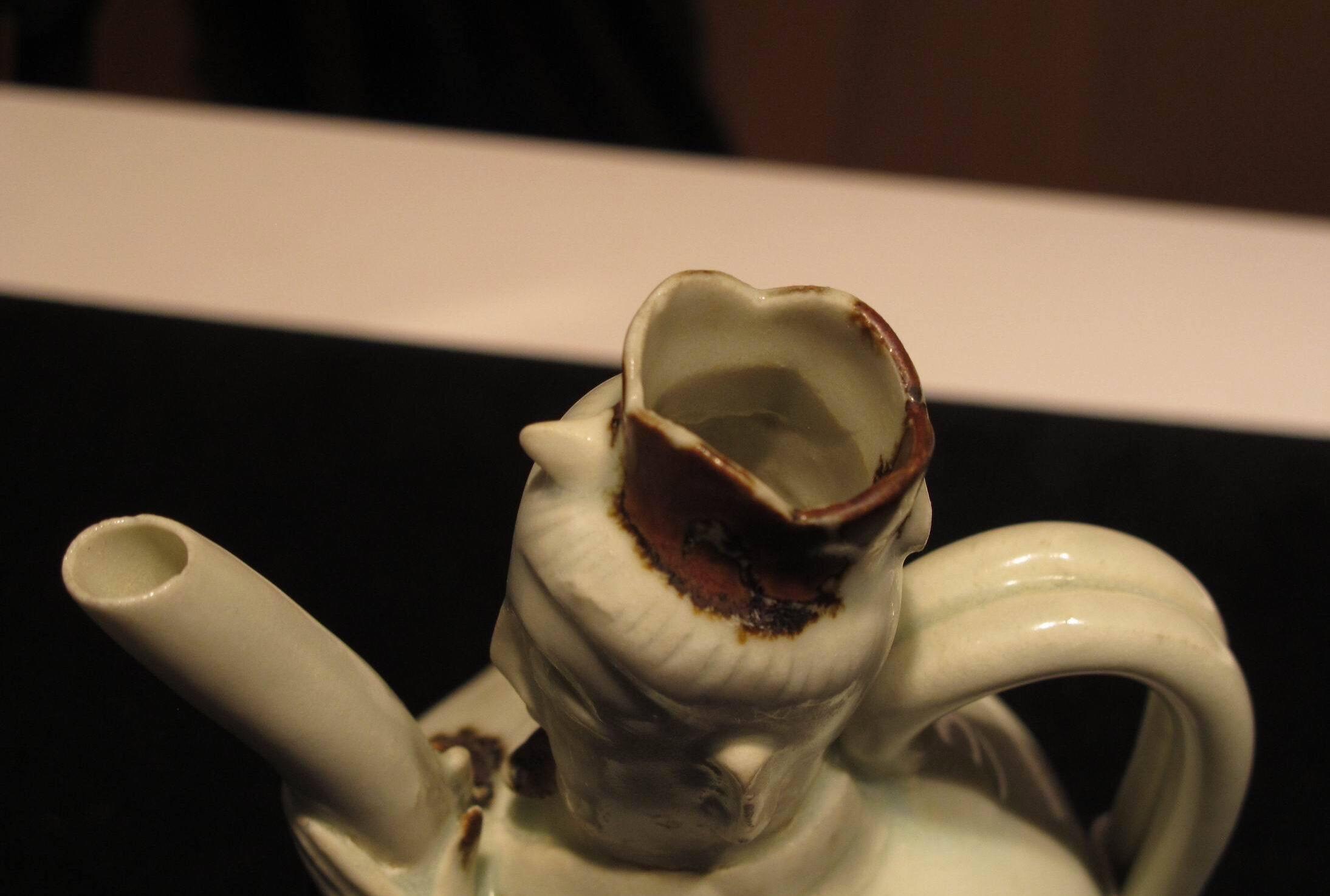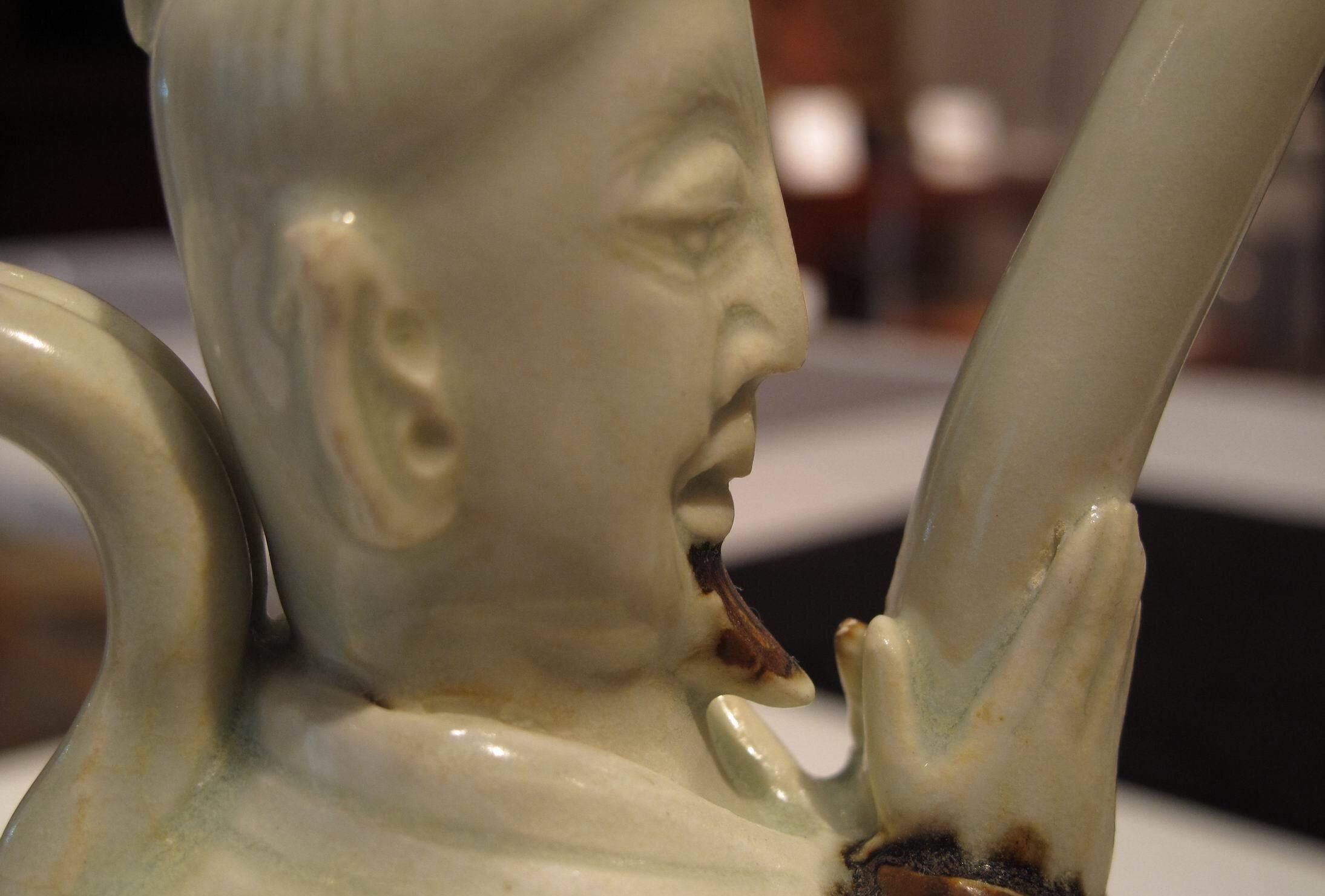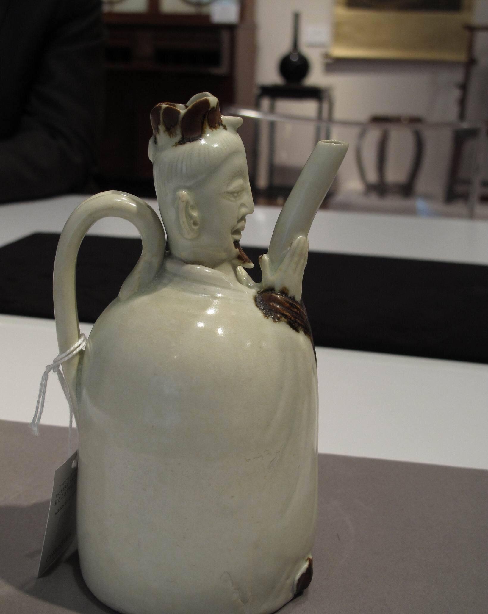 在预展现场我们重点拍摄了这只青白釉加褐彩的人形壶,造型十分奇特,为一文官手持玉圭状,留下了当时的服饰特征。根据佳士得专家整理的资料,同类的藏品几乎没有上拍的记录,而只有安徽省境内的宋墓曾经出土过两件类似的。该件拍品年代也应为北宋时期,估价6-8万美元,估计最终的成交不会便宜!