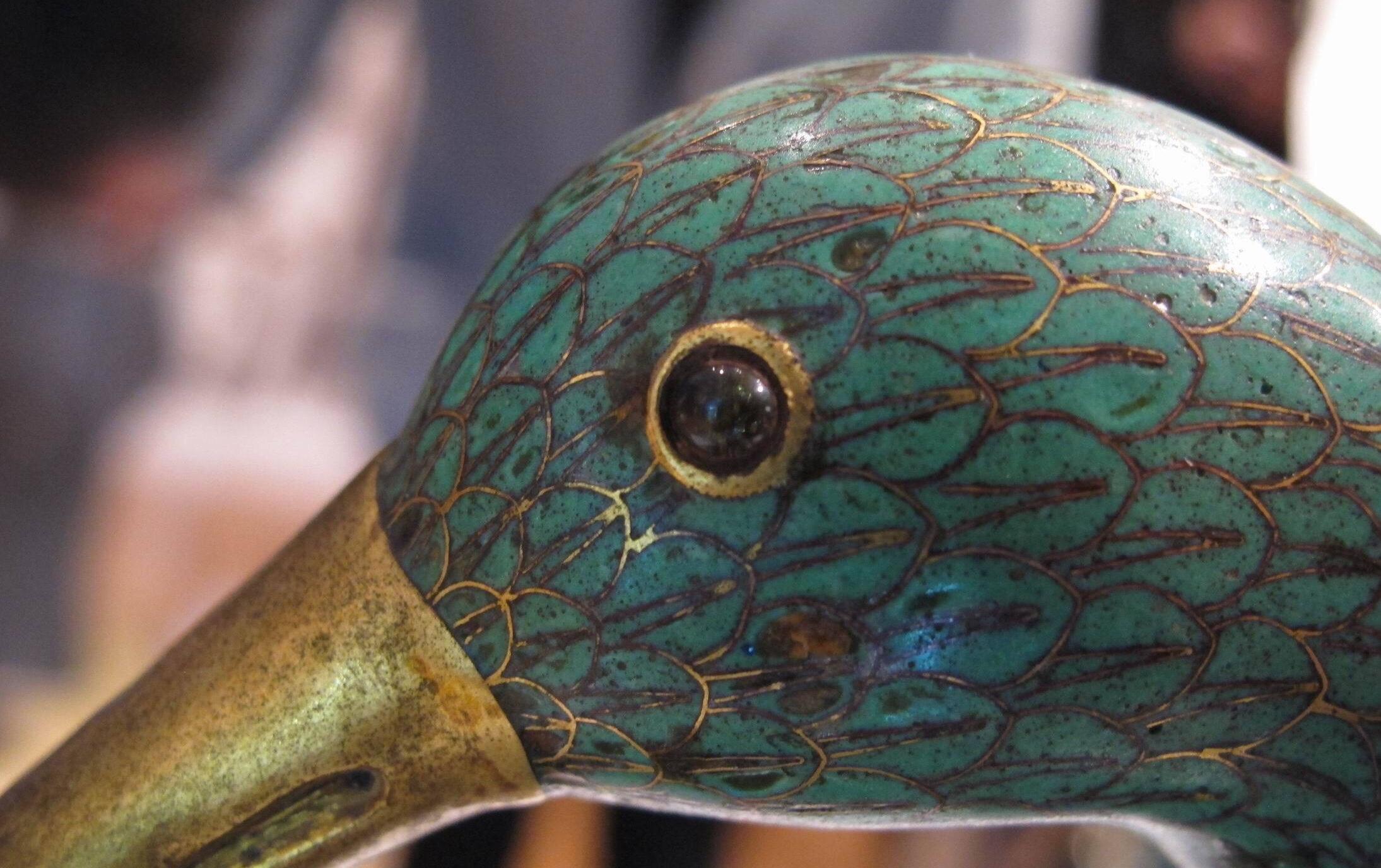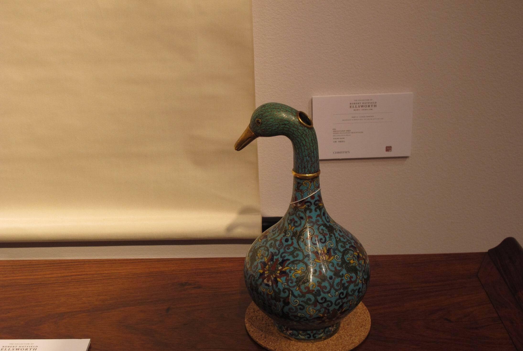 这只掐丝珐琅鸭子在预展现场十分惹人喜爱,仿古造型,萌萌的,大象也忍不住上手摸了摸,只是可惜年代不算特别久远,佳士得定的年代是乾隆,估价4-6万美元,相信这只吉祥物在18日的拍卖现场会有不少买家关注。