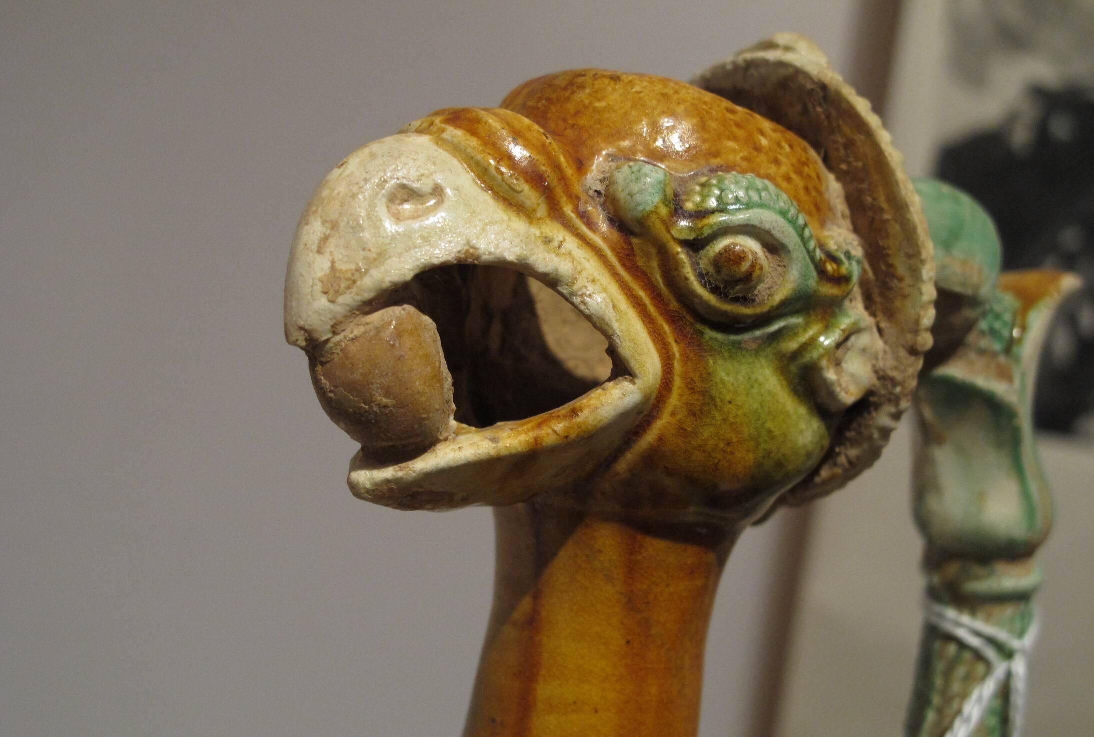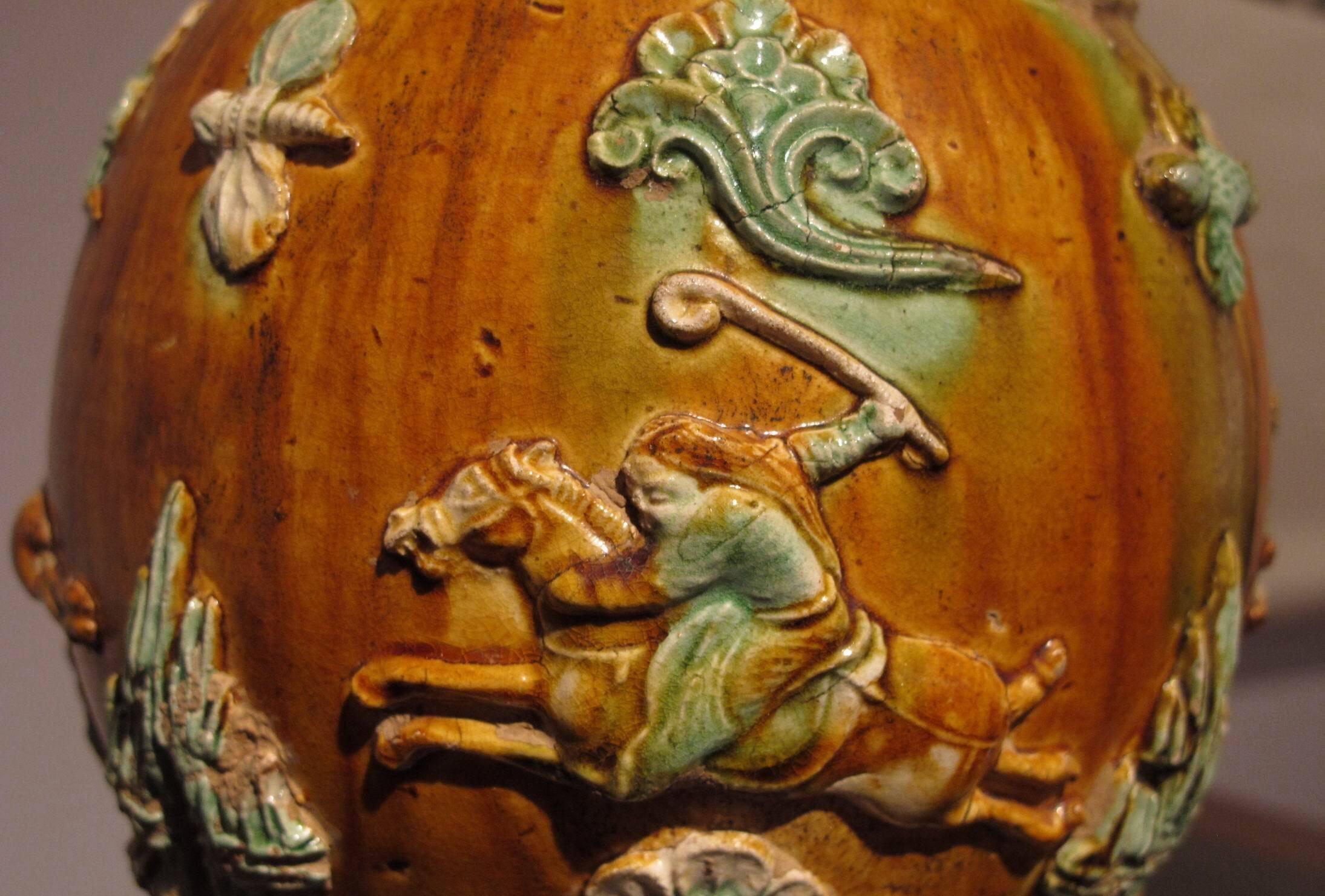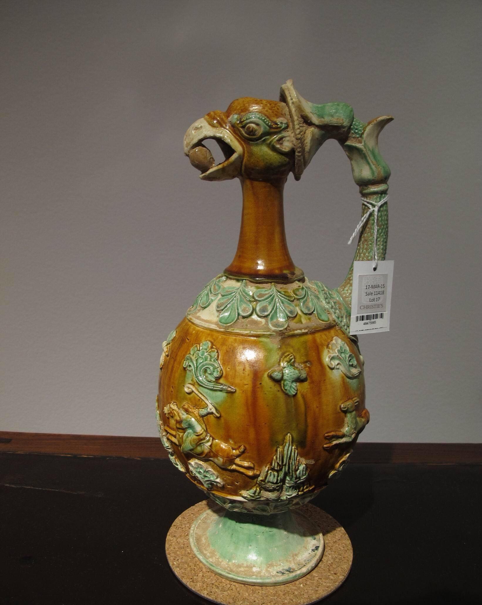 这只唐三彩的凤首水注绝对是一件高级的藏品,出现在纽约时间17日的夜场之上,估价10-15万美元将会有非常大的价格弹性。整件水注的器形应该完全受到中东文明的影响,应该是脱胎于6-7世纪中东萨珊帝国的金属器,而壶身上的纹饰则是在唐代皇家十分盛行的马球(我们在很多唐代皇家墓葬壁画上都可以找到精美的马球图案)。如果喜欢收藏唐三彩,相比较这件,很多普通的三彩马都是浮云了。