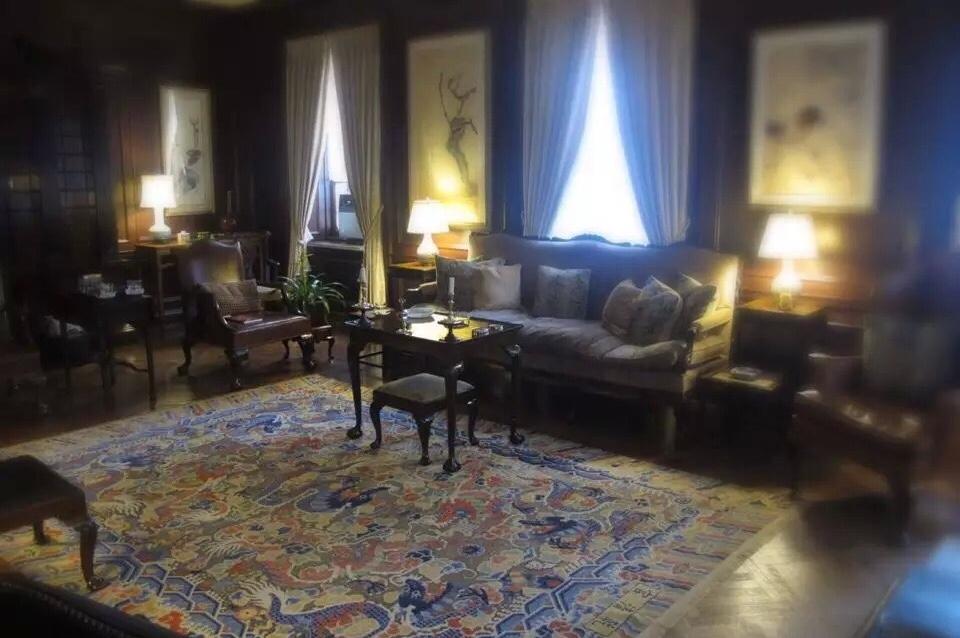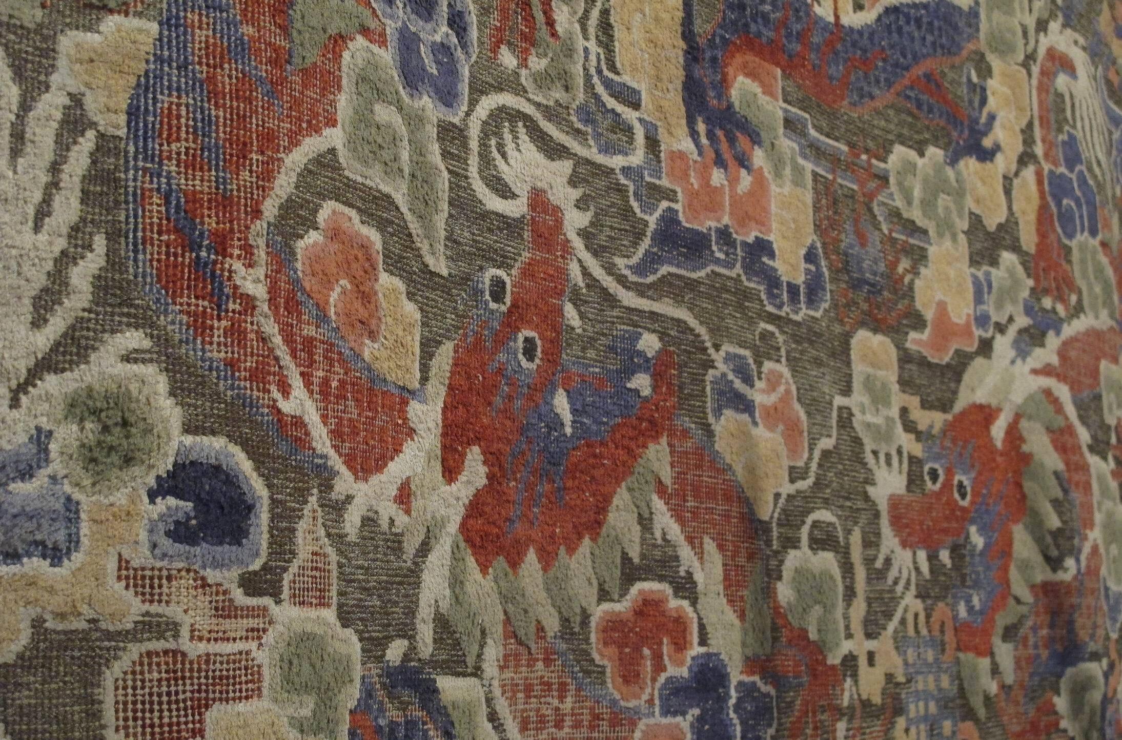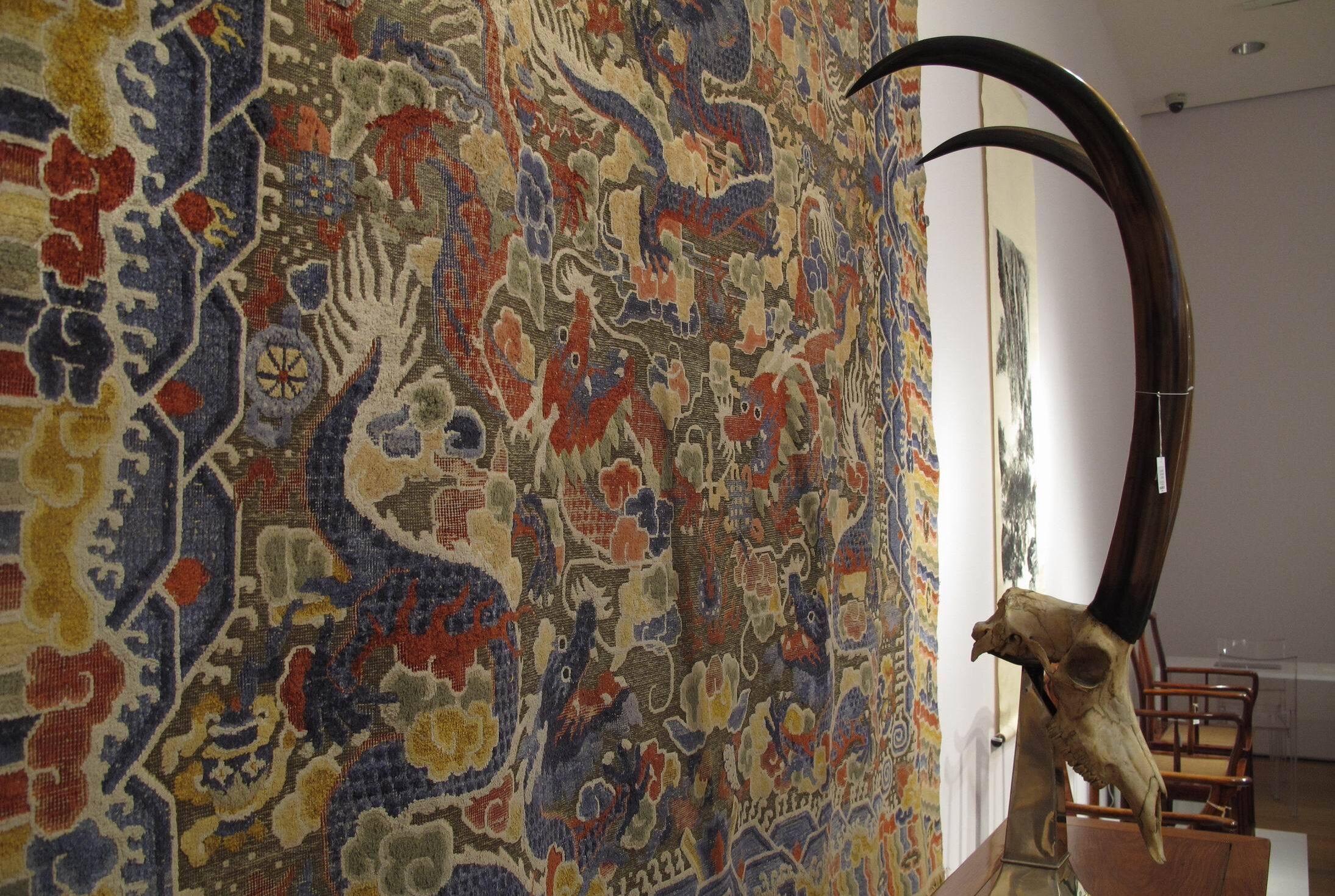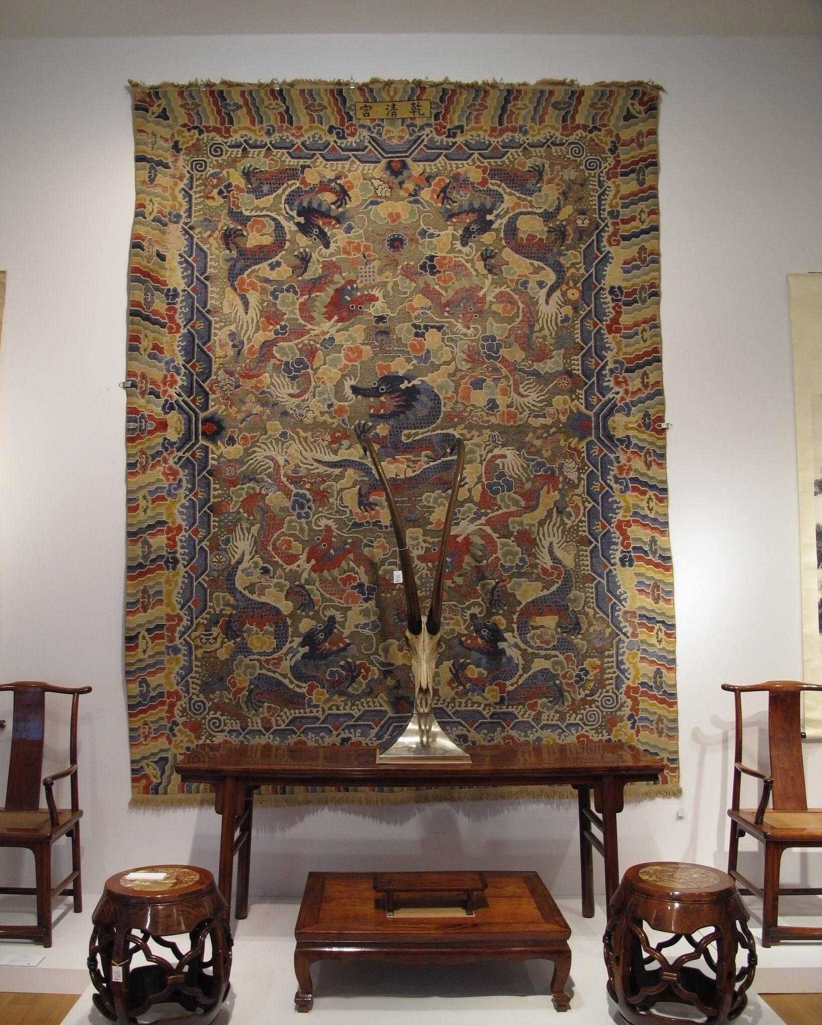 这件“乾清宫”盘金属丝九龙纹毯一直是安思远生前大会客厅所用,3.61米长,2.67米宽,放在客厅的视觉感官十分气(tu)派(hao)。安思远生前一直将它的年代定为乾隆时期,但其他的一些美国专家包括佳士得都定相对保守,认为是十九世纪中晚期之物,估价3-5万美元。您怎样看呢?