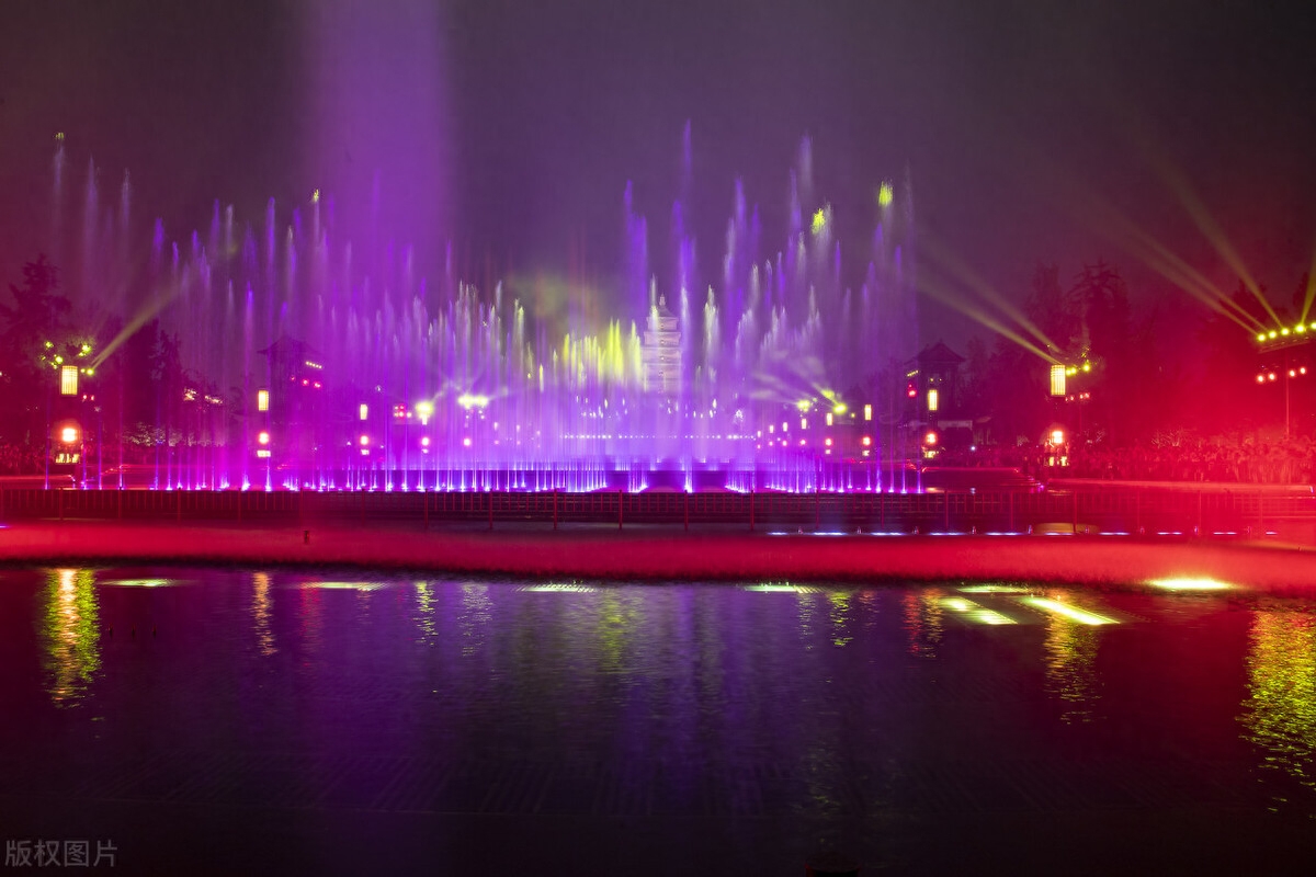 元旦跨年,一定要来大雁塔北广场,看一场水舞光影秀,广场两边的景观树都布置上了花灯,北广场上的音乐喷泉水秀,加上绚丽多彩的灯光秀,真的很好看,这里也是亚洲最大的喷泉,一定要晚上来看,非常震撼!