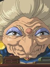 澡堂“汤屋”的主管,同时也是镇上的管理人,是个人人畏惧,法力强大的独裁者。她性格残忍,贪财,命令凡是不工作的人都要变成猪被吃掉,而为她工作的人都会被拿掉名字,一旦记不起来,就永远都离开不了她的澡堂了。她还经常会化身为黑翅膀的大鸟出门巡视 ;然而,她对澡堂的客人却是百依百顺,笑脸相迎,每天都在房间里数钱记账,是一个十足的吝啬小老板形象。尽管汤婆婆看起来权力很大,面对自己的宝贝儿子却完全没有办法,可以说是到了无所不从的娇惯地步。尽管是一个十足的恐怖反面角色,宫崎骏却淡化了对这方面的描写。