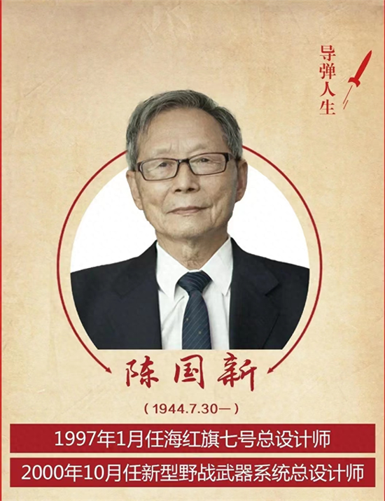 陈国新,西安军事电信工程学院(我校前身)1966届地空导弹无线电遥控专业校友,曾任二院二部副主任、海红旗七号武器系统总设计师、新型野战防空导弹武器系统总设计师等职务。带领型号团队先后解决完成了海红旗七号雷达精度、红外跟踪器、引信和引战配合等问题,培养了一支高效、精干的研制队伍,开创了我国防空导弹研制史上舰载超低空领域的先河;圆满完成新型野战防空导弹研制任务,运用系统工程的方法解决产品研制中的关键技术,树立了以设计为中心,以试验、验证为重点的思想,为型号研制的顺利进行作出了重要贡献。先后获国家科学技术进步奖一等奖2项,二院有突出贡献专家、中国航天工业总公司有突出贡献专家、中国航天基金奖“特别贡献奖”等荣誉,享受国务院政府特殊津贴。