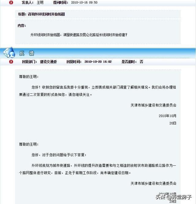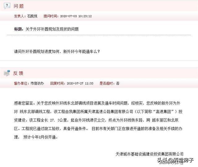 当时,天津市城乡建设和交通委员会给出的答复是:外环线规划为城市快速路,外环线的提升改造需要和与之相连的放射状市政道路或公路作为一个路网整体进行研究,目前,正处于前期工作阶段,尚未确定建设日期。