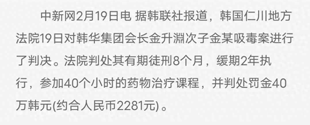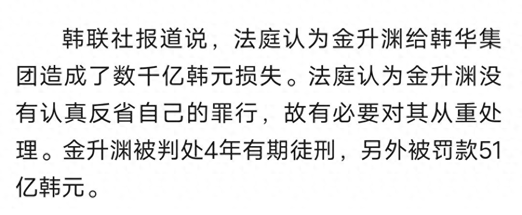 堂堂一个大财阀,因为替儿子出头,涉嫌绑架,涉黑,以黑社会方式报复人被判18个月。当时他的律师就恳请以金升渊对韩国经济有贡献为由申请从轻处罚,但是没被认可。