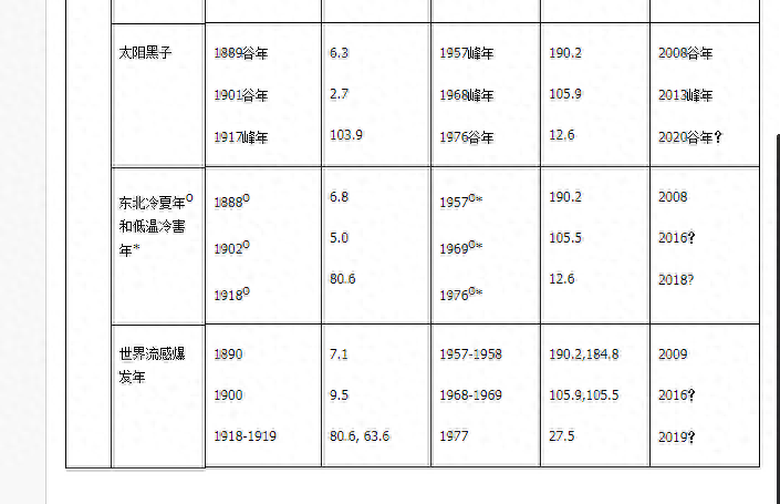 表3 太平洋十年涛动(PDO)、低温、全球性流感、太阳黑子、厄尔尼诺、拉尼娜等对比