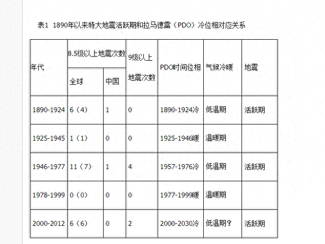 表1 1890年以来特大地震活跃期和拉马德雷(PDO)冷位相对应关系