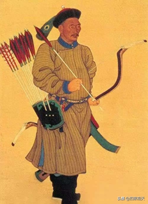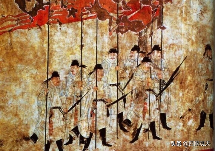我们现在还可以在古代画像中看到古人平常放弓松开,放在弓囊中,下图中,士兵们腰间黑色的长条就是松开的弓,再下图中鲜卑男子弓囊中扁担一样的东西也是松开的弓。
