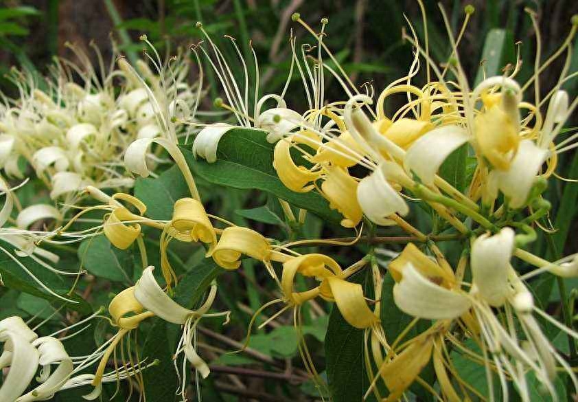 白色和黄色的花长在同一根枝条上,金银花是藤蔓植物。金银花能做花茶,清热解毒,降火凉血。