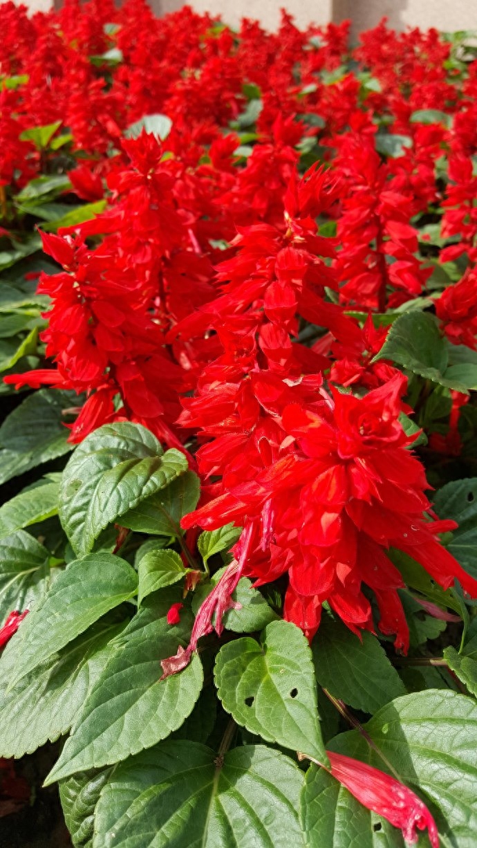 这个是名副其实的一串红,下面是大大的翠绿的叶子,上面是红得很纯正的一串串花朵。