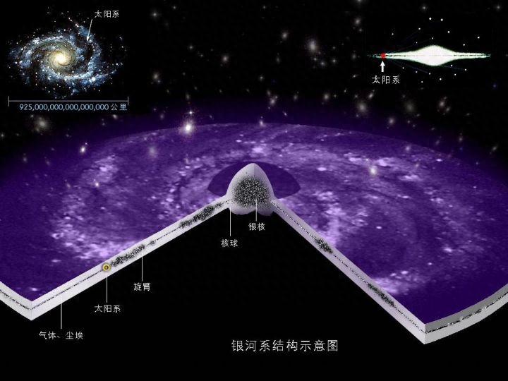 银河系结构图,首先请注意右上角横截面图,银河系的银核集中了银河系几乎绝大多数的恒星,其次请注意左下角“气体、尘埃”的文字描述,“风轮”指气态物质,“水轮”指液态物质,“金轮”指固态物质,统称“尘埃”。