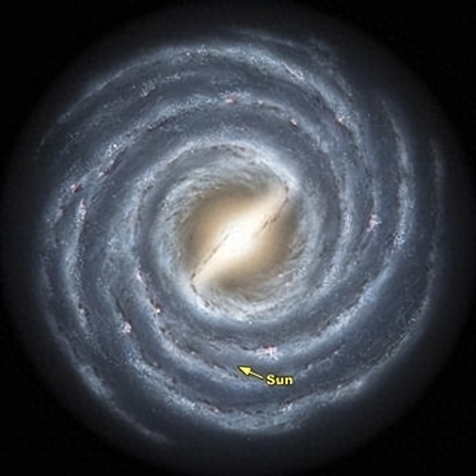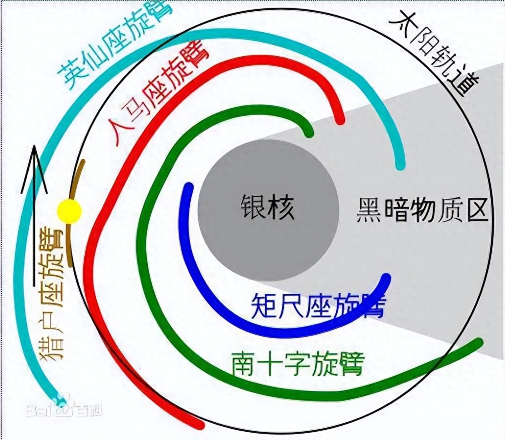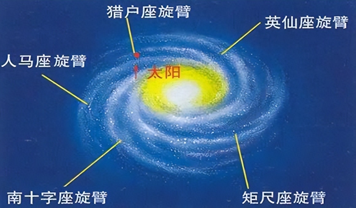 太阳系在银河系旋臂内的位置。银河系是旋涡星系,有多条旋臂,它有三个主要组成部分:包含旋臂的银盘,中央突起的银心和晕轮部分,而旋臂主要由星际物质构成。