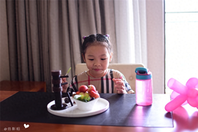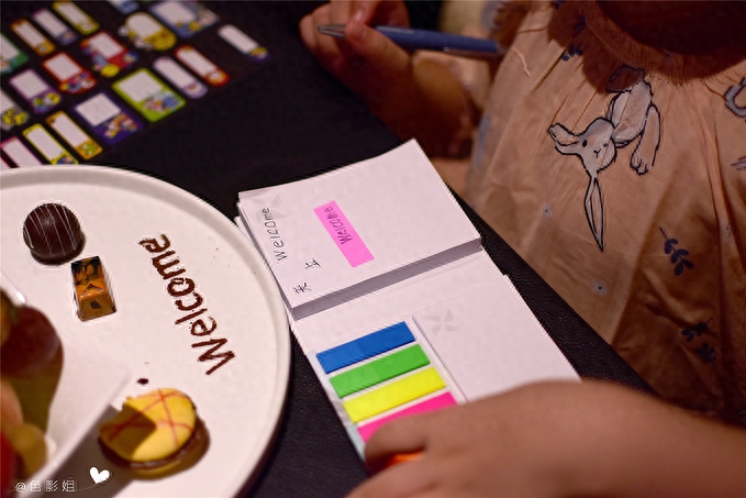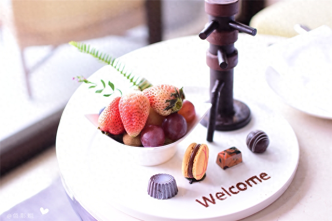 发现酒店还送了一个欢迎水果盘,有水蜜桃草莓蓝莓和巧克力,小朋友很喜欢,但更感兴趣的是盘子上的一行巧克力粉写的字母Welcome,小朋友说这是什么,姑姑你读给我听,姑姑说这是欢迎的意思。