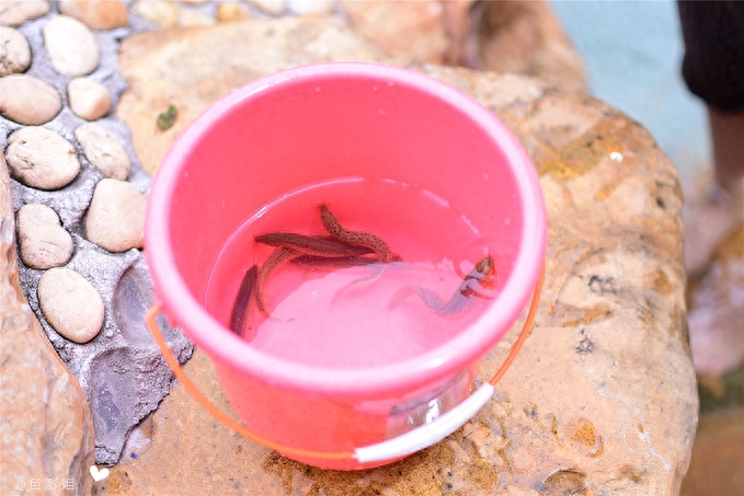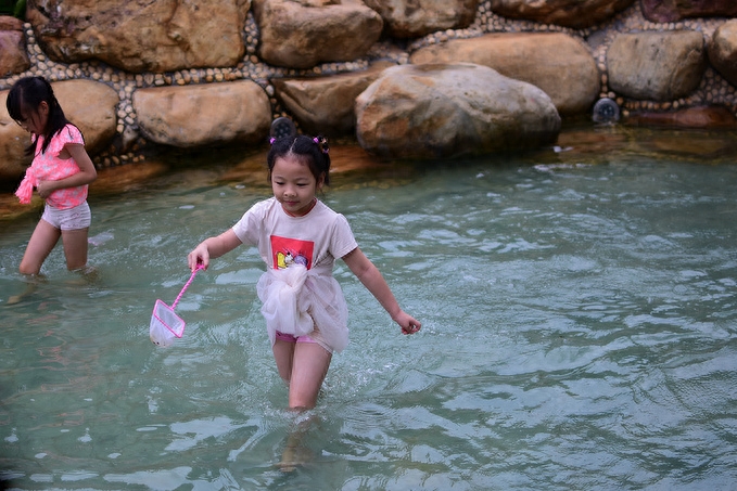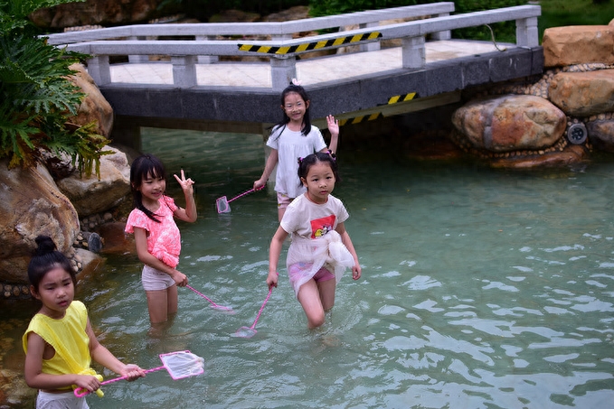 如果说艺术品对小朋友来说相对有点深奥,那捉泥鳅的游戏深得小朋友的喜欢,大家高高兴兴的来到捉泥鳅的地点,酒店后边花园里的一个池子,这里养着小泥鳅,可以让小朋友体验捕捞的乐趣。脱下小鞋子,卷起小裙边,拿着小捕网,寻找水里的泥鳅,看准了一网舀过去,但是小泥鳅是很机灵的,池子对于泥鳅来说空间挺大的,抓到它们不容易呢。这样在水里窜来窜去,没抓到几个泥鳅,但是小朋友很开心,那就够啦!