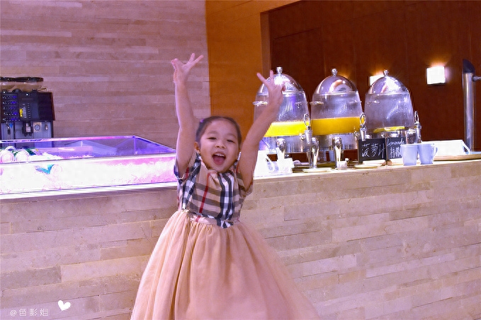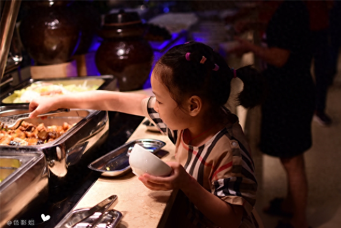 差不多时间,带锦宝去吃自助晚餐,餐厅很大,顾客满座,相当热闹。菜品特别丰富,各种中式菜肴,各种面包蛋糕甜点,海鲜刺身,牵着锦宝在自选区逛了一圈,锦宝可是一个很有原则的小宝宝,不喜欢的坚决不要,百般诱惑失效,最后用一个小碗给小宝贝装了几块猪肉炖土豆,还有一点炒米粉,两根烤肠,小朋友好喜欢番茄酱,不管什么菜肴,沾着番茄酱吃就很美味。当然了巧克力喷泉是很受欢迎的,没有小朋友不喜欢吧?锦宝喜欢粉红色的棉花糖,拿一串放到巧克力喷泉下,镀一层巧克力外衣,再放到冰水里冻一冻,就变成巧克力串串了,一口吞到嘴里,棉花糖巧克力是什么味道?锦宝宝知道:)