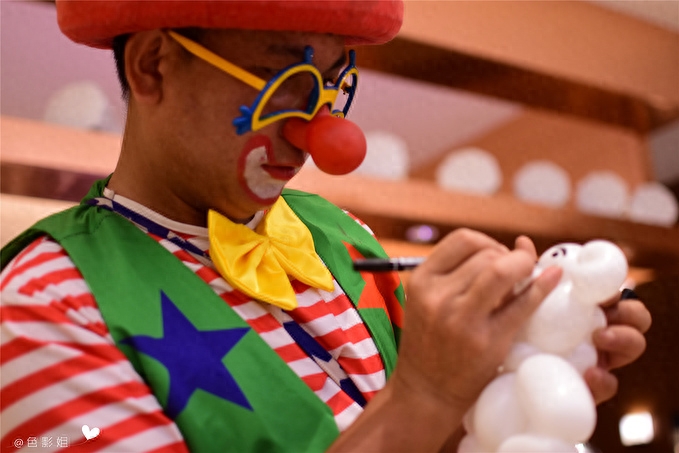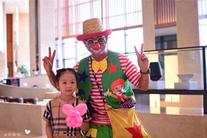 大堂里还有一位小丑叔叔,有一次和小朋友们互动,小丑叔叔的背包是一个大宝库,从里面能变出好多可爱的气球萌物,小丑叔叔约镜宝贝一起划拳,好个宝贝赢了,小丑叔叔哗啦哗啦,两分钟就做了一个粉红的小兔子,还画龙点睛的用油性笔给它画上了眼睛,鼻子和嘴巴,还有腮红,这一画完真的更像兔子了,捧着小兔子真是一脸的满足呀!