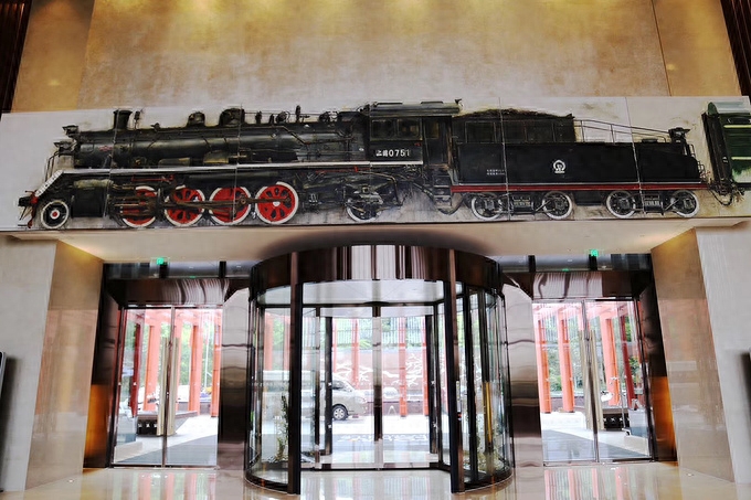 《798大火车》,一进酒店大堂,回头一望,就在大门内墙顶上发现了这副作品。以北京 798 艺术区中生产于唐山机车制造厂 20 世纪 70 年代初的蒸汽火车头为主角,一方面回顾历史,展现新中国工业化的起步,以及对于风雨无阻使命精神的继承;另一方面,作为一种创意形态的视觉观光物,是再未来拓展的一个前进方式。凭着画面,依旧能感觉到蒸汽机车带来的历史厚重感,以及时代的变迁与创意气息赋予老火车新生命的延续。