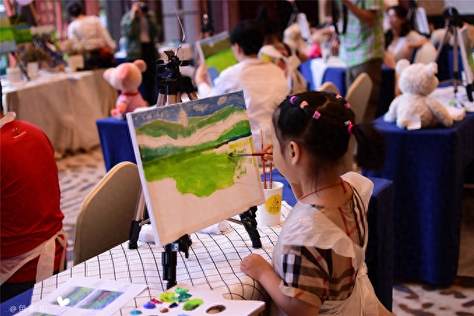 这次过来参加草坪艺术节的,有很多小朋友和家长,大家对这一堂油画课都是期待已久,认真的听美术老师讲解,然后开始作画,这次画画的主题就是大雁山和纪元塔,还有山脚下的艺术酒店,酒店的形状就像一只展翅欲飞的大雁。