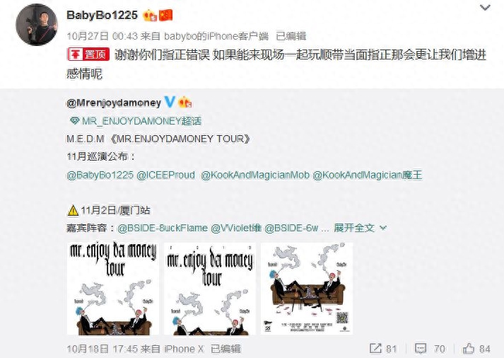 小兄弟们出的diss都很一般,而且BabyBo把“对待兄弟respect”唱成了“对待兄弟rest in peace”,BabyBo回应,谢谢指正错误,如果你们能来买票看演出那就更好了。