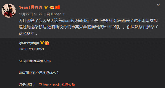 “我根本没有听说过的肖恩恩,我只看过僵尸肖恩那会我是高中生”,Melo在最后diss了肖恩恩几句,肖恩恩是Mercy的兄弟,自然要站出来挺Mercy。