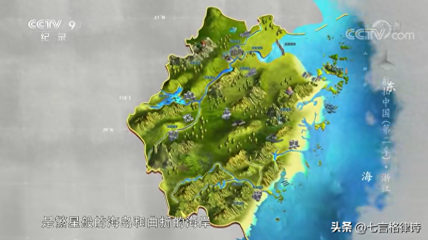 浙江位于中国东南沿海,一条曲折的大江将这块土地划分为东部与西部,起伏的山脉从西南向东北绵延伸展,版图的东部是繁星般的海岛和曲折的海岸。