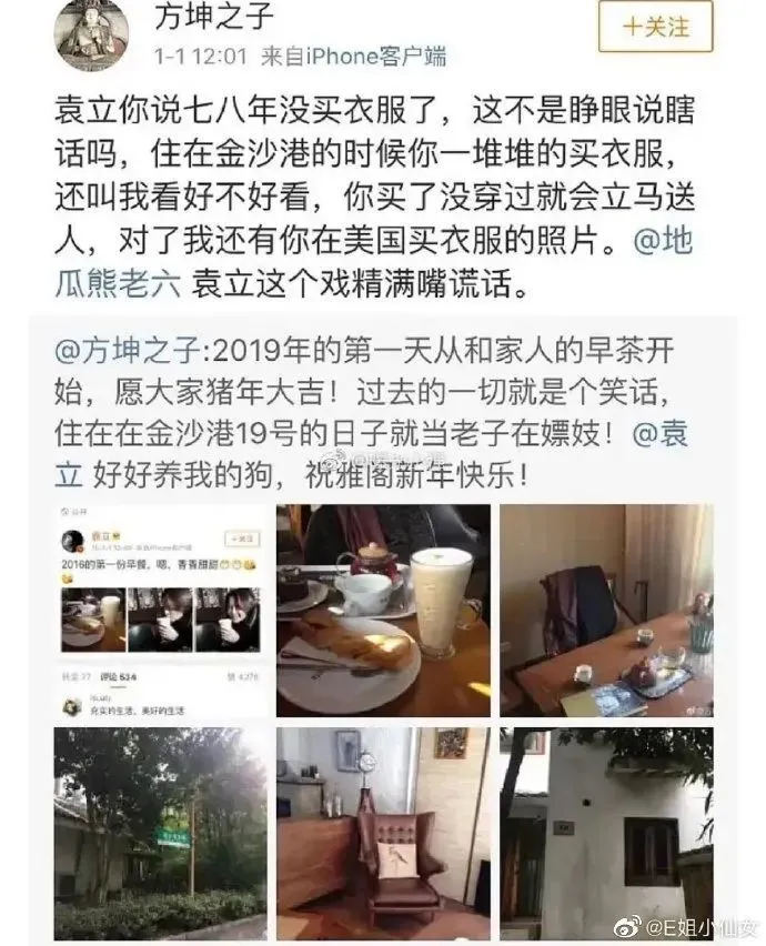 2019.1.1,他贴出与袁立同居的地址,还称自己手上还有袁立美国买衣服的照片。