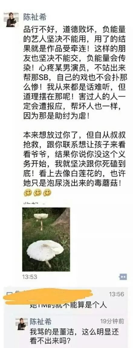 而陈祉希会发这个,真是因为董洁的闺蜜这一套“好姐妹从未有过阻止父子相见的任何言语和行为”的说辞激怒了。