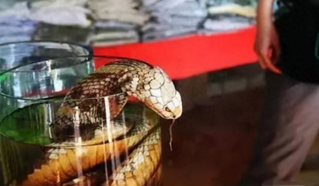 2001年一个村民用一条眼镜蛇准备自制蛇酒来喝,他将蛇放入自家的米酒中浸泡。