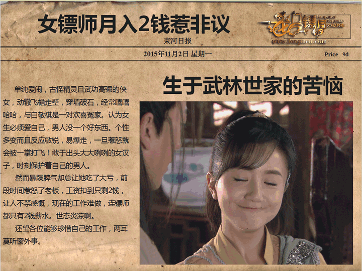 还有在《龙门镖局》里,饰演武功高强、动辄飞檐走壁或穿墙破石,一个月收入却只有2钱的吕青橙。