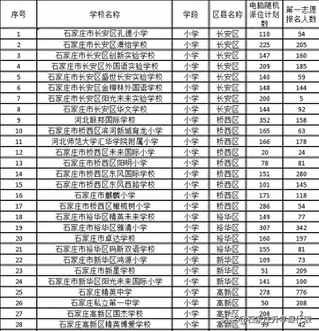 1.11所学校需要摇号招生:私立第一中学、新星学校、精英中学、东风国际小学、东风西路小学、卓达学校、桥西未来国际小学、雅清小学、长安区创新实验学校、河北师范大学汇华学院附属小学、桥西阳明小学。