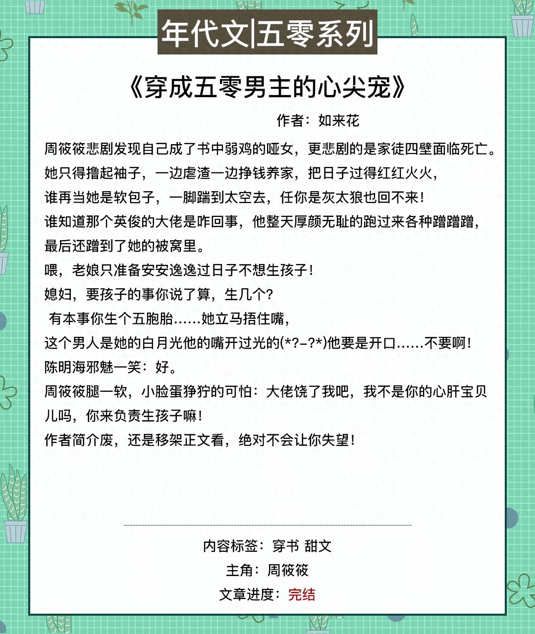 第四本《穿成五零男主的心尖宠》作者:如来花(还没看!等排雷)