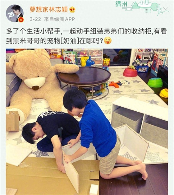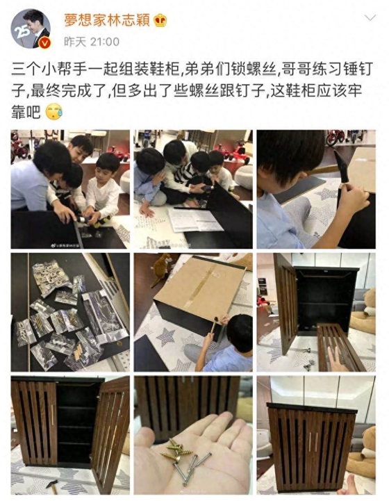 近日林志颖晒出一组照片,他和三个儿子一起组装鞋柜,看起来其乐融融十分幸福,并配文:"三个小帮手一起组装鞋柜,弟弟们锁螺丝,哥哥练习锤钉子,最终完成了,但多出了些螺丝跟钉子,这鞋柜应该牢靠吧"。