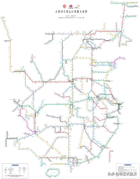 下附全国动车组运线线路示意图(20210711-上海局宋文彬制)含港铁西九龙站、台湾铁路。