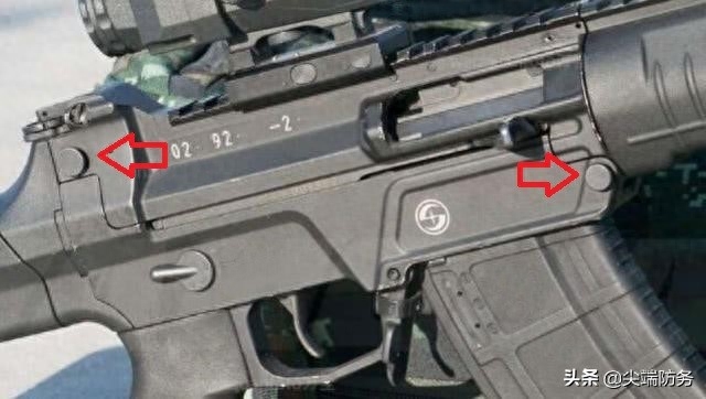 新枪采用伸缩枪托 箭头所指为调整枪托长度的按钮