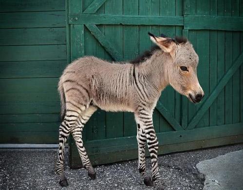 还有就是斑驴,斑驴是斑马和驴交配而成的产物。头像驴,身体像斑马,身上还长着斑马的斑纹。斑驴是很罕见的杂交动物,因为驴和斑马的染色体不相容,所以成功诞下的斑驴很稀少。