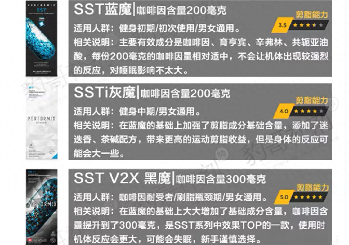 通过这几款“魔产品”我们可以看到里面所谓的有效成分,它们分别是咖啡因、育享宾、辛弗林、共轭亚油酸和茶碱。眼尖的朋友可能还看到了灰魔里面的迷迭香,不过迷迭香跟减肥基本上没什么关系,网上的传闻并不多见,所以在这里我就不描述了,感兴趣的朋友可以自行查阅。