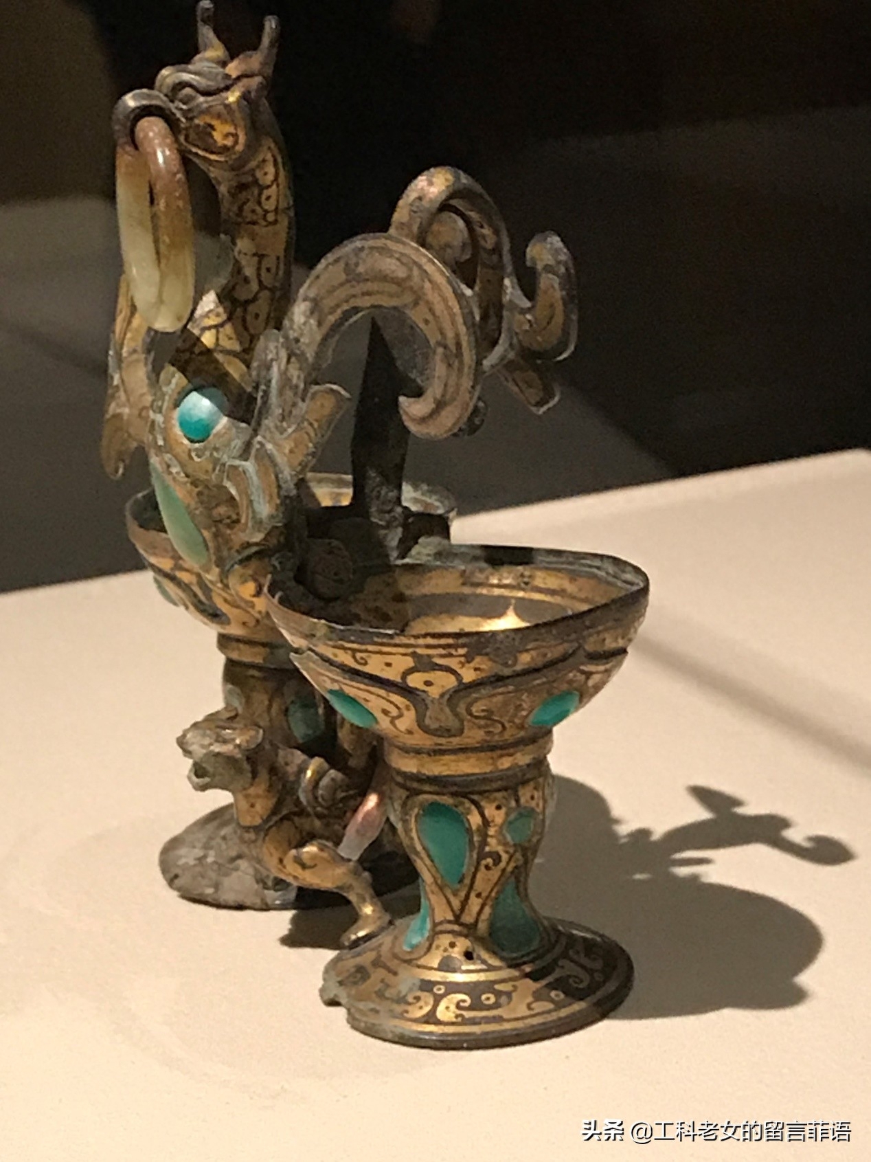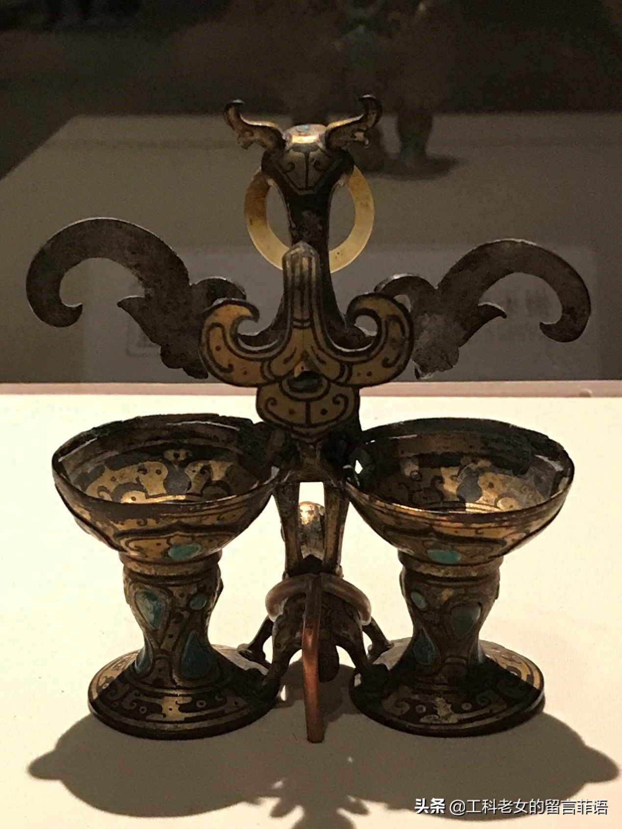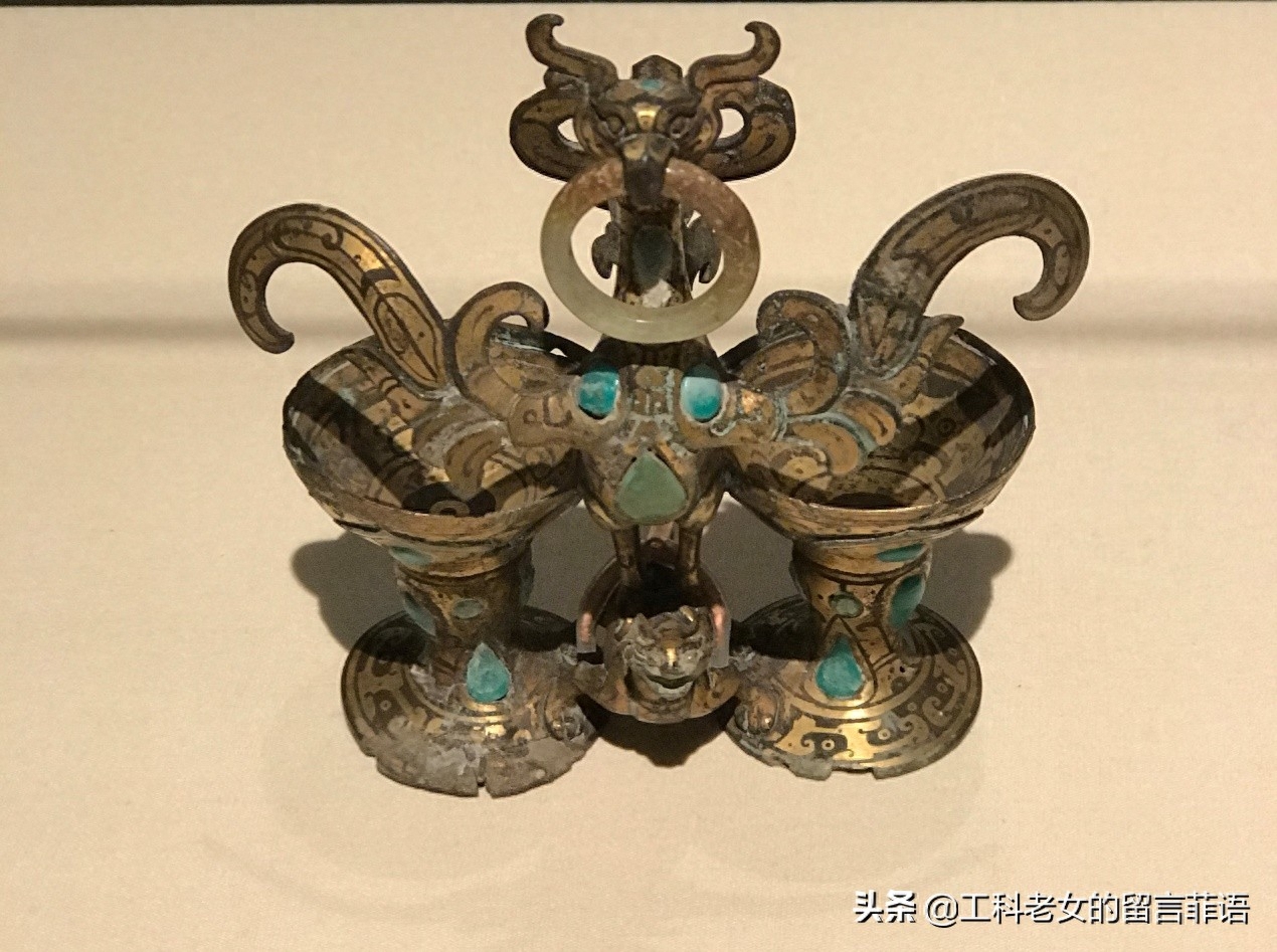 这件文物的整个造型非常独特,中间是朱雀,衔着一枚可以自由转动的玉环,挺立在一只小神兽的背上,而这个匍匐神兽的双足又紧扣住两个高脚杯。朱雀的颈部和腹部,两个高脚杯的杯身上镶嵌有10来颗绿松石。