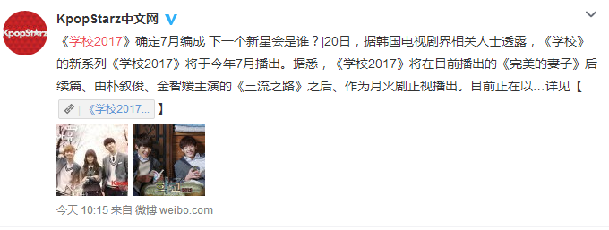 这部红极多年的系列剧在2017年又将有最新的版本,有消息称韩剧《学校2017》将于7月KBS月火档期编成,目前10代~20代年龄层的演员们正在试镜中。