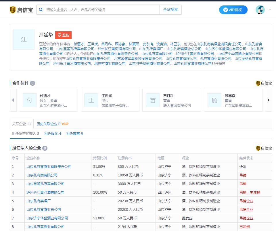 根据启信宝的数据显示,几乎所有当年孔府宴酒掌门人江廷华有关的孔府宴酒相关企业尽皆处于吊销状态,谁都不会想到当年如此红火的孔府宴酒竟然会沦落到如今的地步。