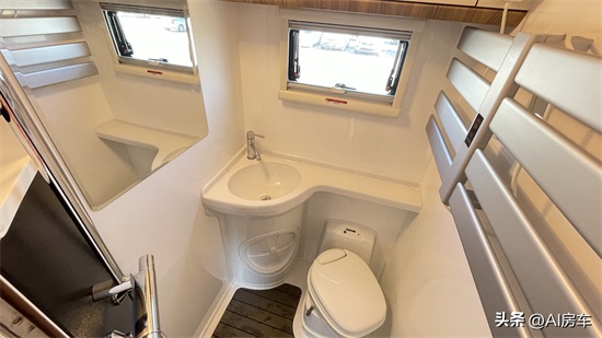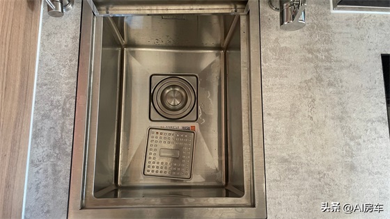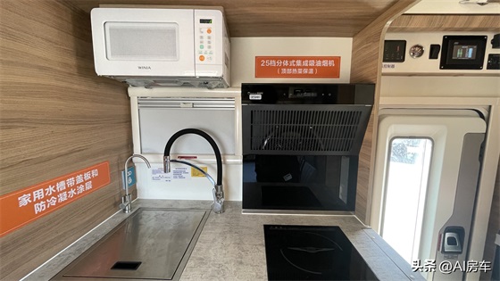 厨房的设计关系到外出旅行中的饮食质量,瓦纳卡厨房的设计在房车中也称得上是上乘,不仅配置有延展板,通风换气窗、储物吊柜+抽屉柜+立体柜、高脚水龙头、大宇微波炉(选装)、LPG报警器、烟雾报警器等常规化的设备,还配置有大功率2000W电磁炉、直饮水龙头、家用带盖水槽(带防冷凝水涂层),以及潜水艇防臭下水器、25档分体式集成油烟机(顶部热菜保温)等高配设计,让外出旅行的饮食更加的丰富多样。