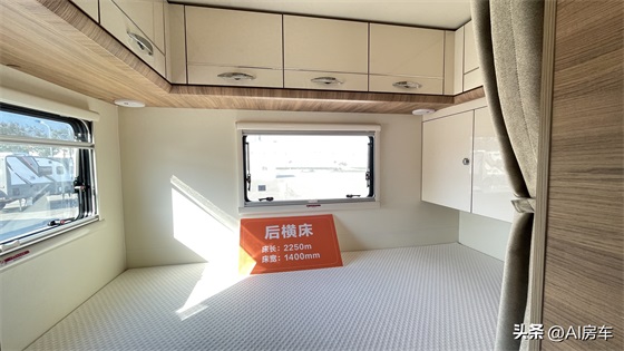 前方额头床位于驾驶室上方,是一张尺寸为2250*1400mm的双人床铺,立体高度达850mm,空间舒服度和后方休息区并没有差别很大,其内配置有舒适透气型海绵床垫、两侧外推窗+置物格、隐私帘、充电设备等设备,还可以选装额头天窗(太阳能板更改为1800W)。