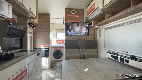 车内空间宽敞,功能齐全,布局合理,因其庞大的车身尺寸,使得每个功能区都有着舒服的空间,整车采用后上车车门设计,前方区域且驾驶室+额头床、会客区和客厅区域,后方区域为卫生间、休息区和大衣柜,并配置齐全的豪华家具组和家电设备,加上浅色装饰风格,打造出一个温馨舒服的6人旅居空间。